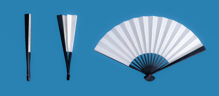 A decorative fan rests on a bright surface showcasing its intricate designs and contrasting colors of orange and blue in an artistic arrangement.