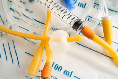 Foley urinary catheter with urine bag for disability or patient in hospital.