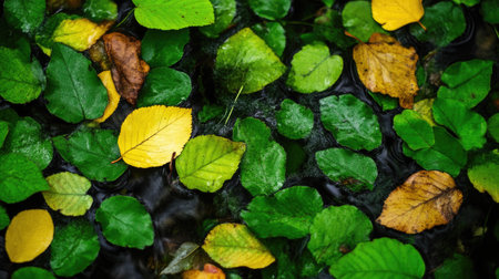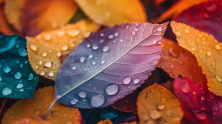 A Colorful autumn leaves with raindrops create vibrant, textured pattern
