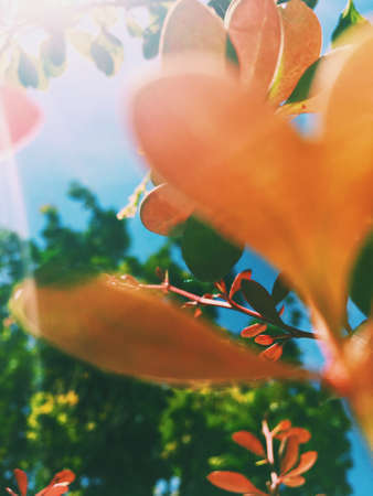 Multiple bright pink leaves on a light blue summer sky background. Red foliage on thin branches on an autumn day. Charming fall scenery. A spacious floral wallpaper.