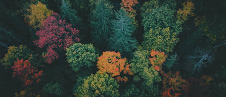 Cinematic view of a vibrant autumn forest showcasing colorful foliage and dense greenery