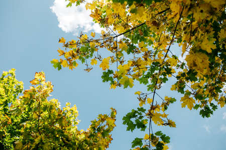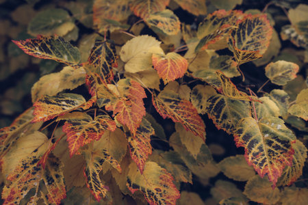 Autumn multicolored yellow red and green leaves background. Wallpaper and background of autumn beautiful leaves of different colors