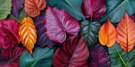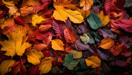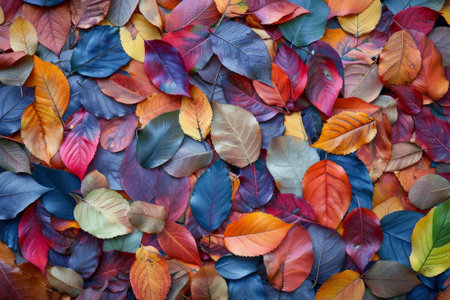 Autumn foliage display vibrant leaves in rich hues, arranged as a blanket, top view, flat lay