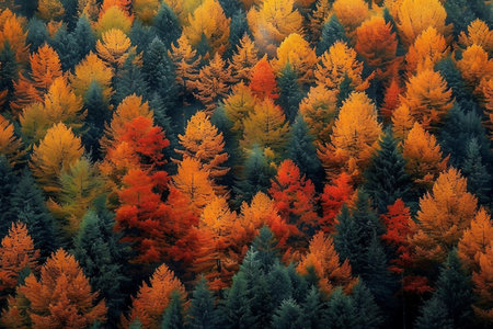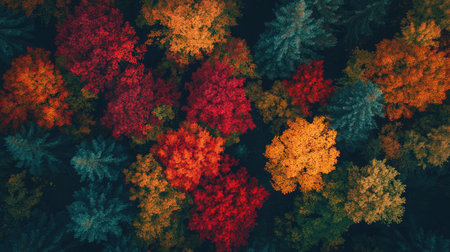 Aerial view of a forest in the fall, with vibrant red and yellow leaves, leaving space for copy.