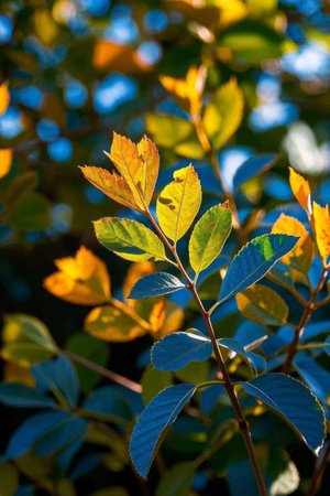 Colorful autumn leaves on tree create a vibrant display in a tranquil forest setting during late afternoon