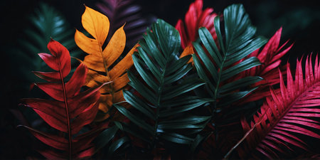 AI Generated. colorful tropical leaves on black background, leaves composition, floral background, manstera, palm leaves Tropical dark trend jungle in neon illuminated lighting