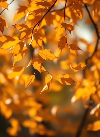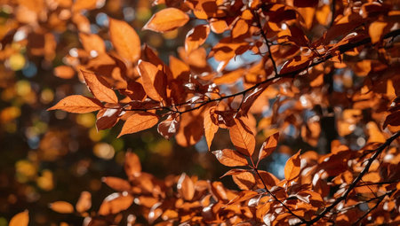 Close-up of vivid orange autumn leaves on sunlit branches, capturing the warmth and richness of fall foliage. The shallow depth of field blurs the background into soft bokeh, emphasizing leaf texture and veins. Ideal for autumn-themed design, nature photography, and marketing materials celebrating fall colors and outdoor scenes.