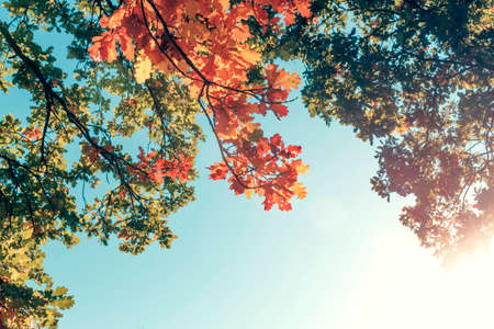 Colorful autumn leaves in the forest on a sunny day. Fall season.