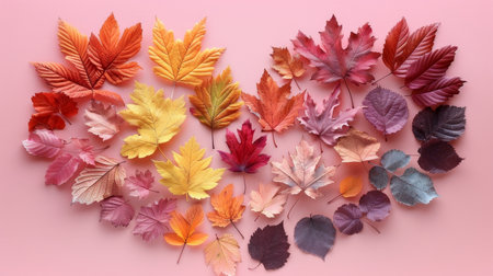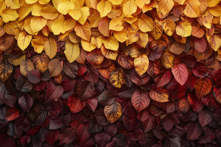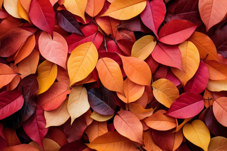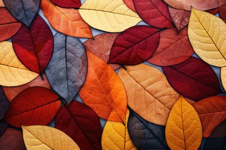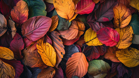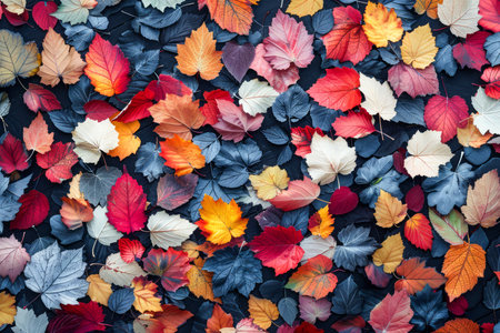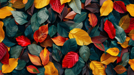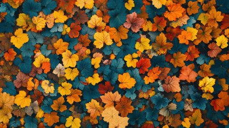 Autumn foliage display vibrant leaves in rich hues, arranged as a blanket, top view, flat lay