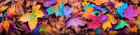 Colorful autumn maple leaves cover forest ground, creating vibrant, natural pattern with red, orange, yellow, and blue hues