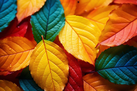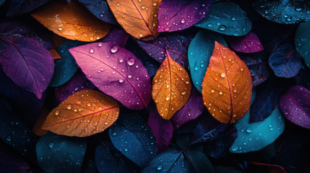A Colorful autumn leaves with raindrops create vibrant, textured pattern