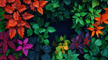 A stunning array of vibrant leaves displayed on a dark background showcases the beauty of nature. Ideal for creative projects, home decor, and artistic inspirations.