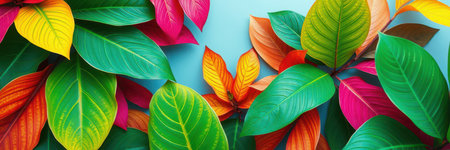 Vibrant leaves in shades of green, yellow, orange, and pink against a blue background