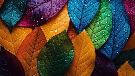 A stunning close-up image of colorful leaves showcasing vibrant hues with raindrops resting on the surface, perfect for exploring themes of nature and the beauty of autumn.