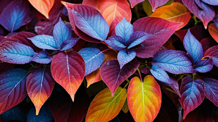 A close-up of colorful leaves adorned with water droplets, showcasing the vibrant hues and natural beauty of nature after a refreshing rain.