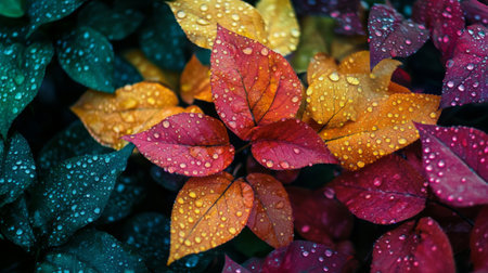 Vibrant leaves in autumn shades with droplets of water create a stunning natural display. Perfect for seasonal themes and nature-inspired projects.