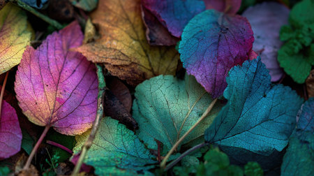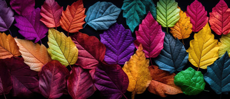 Discover a stunning array of multicolored leaves showcasing intricate patterns and textures against a dark backdrop. Perfect for nature-inspired designs.
