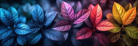 Gradient lighting illuminates a variety of leaves, creating a stunning spectrum from cool blues to warm yellows.
