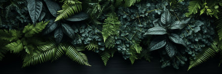 lush green tropical leaves and ferns on a dark background. Perfect for a natural backdrop, creating a relaxing atmosphere, or adding a touch of greenery to any space.