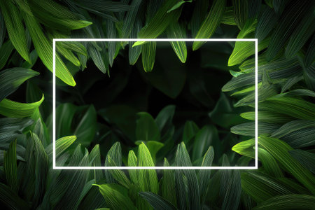 An overhead shot presents vibrant green leaves surrounding a central, white rectangular frame. The composition features a dark, natural background and exhibits a contrast between light and shadow. The image emphasizes natural textures, suitable for design elements or commercial projects that require a background.