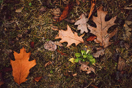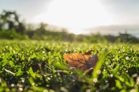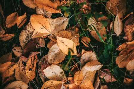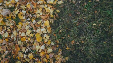 Dry, yellow foliage on the green grass. Autumn gradient. Autumn background