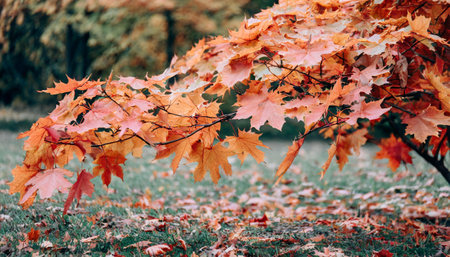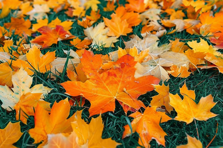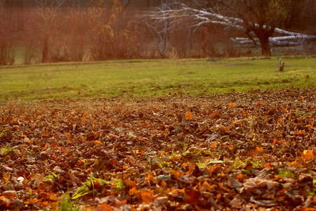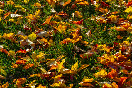 Yellow, orange and red september autumn leaves on ground in beautiful fall park. Fallen golden autumn leaves on green grass in sunny morning light yard, toned photo. October landscape background