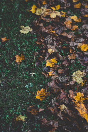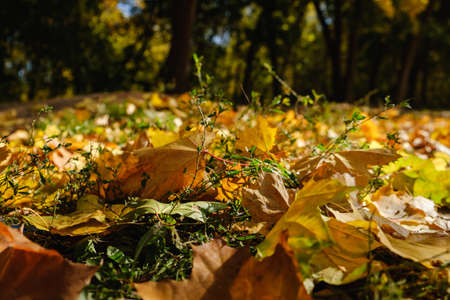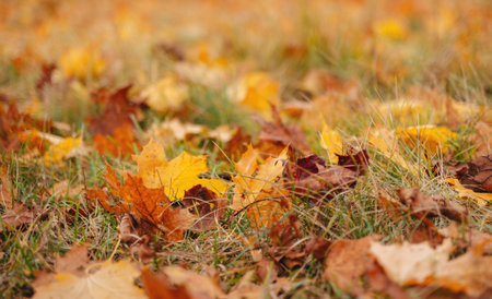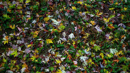 Colorful autumn leaves on the grass in the park. Seasonal background