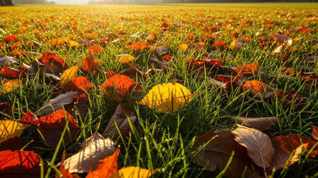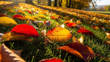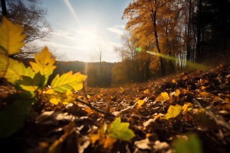 Captivating view of golden autumn leaves scattered on the ground, bathed in warm sunlight, with trees creating a serene backdrop, representing the beauty of fall.