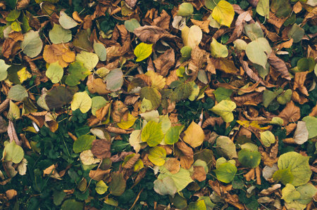 Texture of fallen yellow green brown withered dry autumn leaves of linden and chestnut