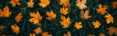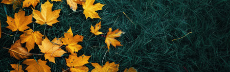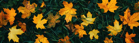 Beautiful colorful autumn leaves on green grass, fall season, view from above, card wallpaper with background copy space, horizontal