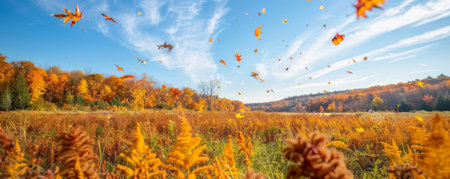 Vibrant autumn background with a field of wildflowers, a blue sky, and scattered leaves.
