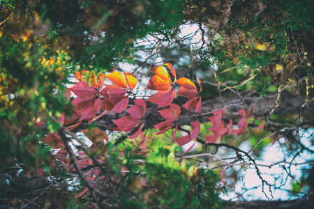 Colorful autumn leaves on tree create a vibrant display in a tranquil forest setting during late afternoon