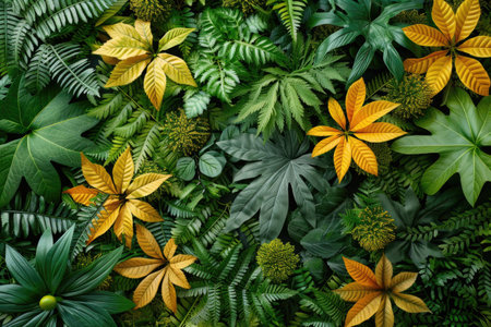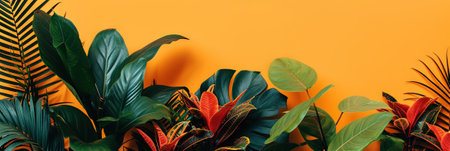 top view of tropical leaves on yellow background, panoramic shot