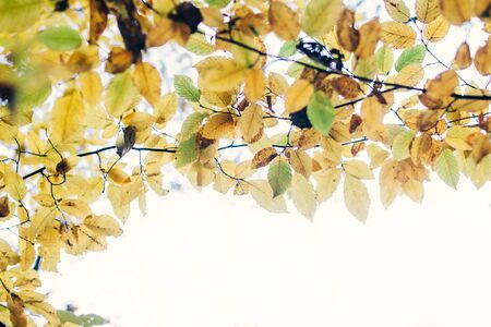 Autumn background. Autumn leaves on tree branch in sunny light with copy space. Beautiful yellow hornbeam leaves on branches in fall. Autumn forest. Tranquil moment