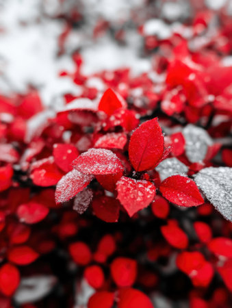 Frozen red leaves in the snow