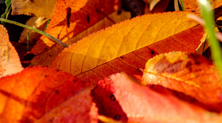 Golden autumn leaves bathed in sunlight. A close-up shot of the vibrant colors and texture of nature in fall