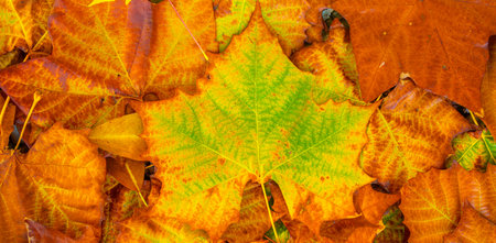 Texture of fallen yellow green brown withered dry autumn leaves of linden and chestnut