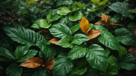 A dense canopy of various lush green tropical leaves and ferns with intricate veining and diverse shapes, creating a verdant jungle backdrop.