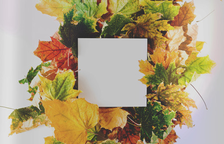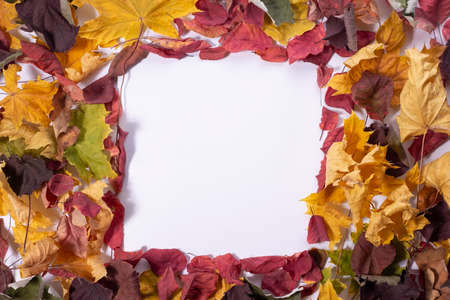 Blank white paper in frame from colorful maple leaves overlap. Autumn background flat lay. Vivid red, purple, orange, yellow foliage. Top view, copy space