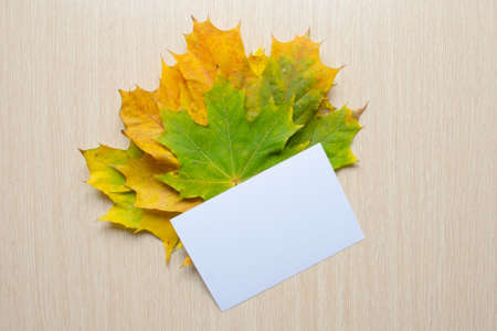 empty white card mockup lying diagonally on fall leaves background