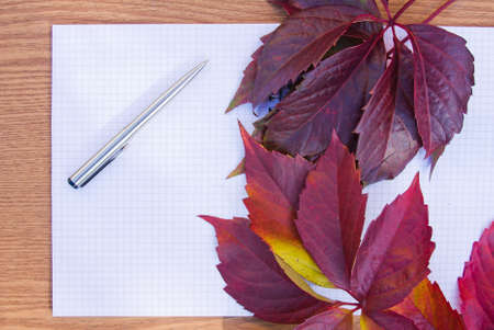 red and yellow leaves of wild grapes and alder near notebook, pen and digital tablet on white table
