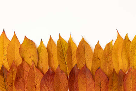 Autumn border. Composition of vibrant red and yellow leaves on a white background. Vintage filtered Flat lay Top view background.