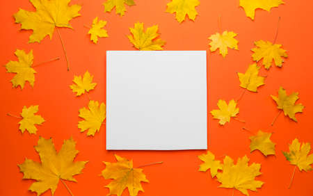 Blank paper with dry autumn colorful leaves on a white background, top view, flat lay