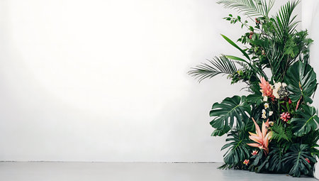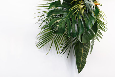 Tropical leaves and flowers on a white wall background with copy space