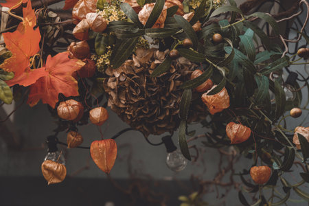 Autumn or Fall composition. Fall maple leaves, orange physalis lanterns and dry brown hydrangea. Mood, lifestile, still life concept. Thanksgiving decorations.