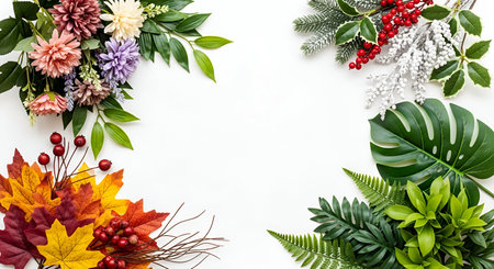 An overhead view of a white surface with various artificial floral and foliage elements arranged in the corners. One corner features a bouquet of soft-colored flowers and green leaves. Another corner displays vibrant red and yellow autumn leaves with berries and twigs. The opposite side has a frosted pine branch with red berries and a large monstera leaf alongside ferns and smaller green plants.
