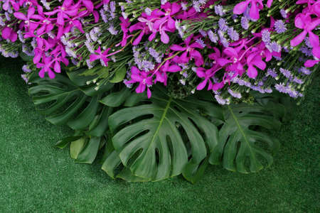 Green leaves of Monstera and fern foliage plants with pink violet orchids and purple aster flowers bunch floral arrangment, nature tropical backdrop on artificial grass green background.