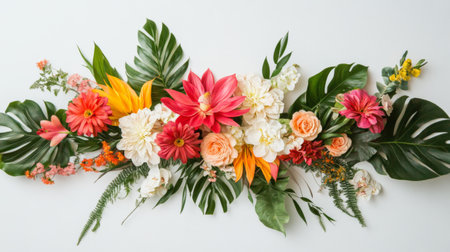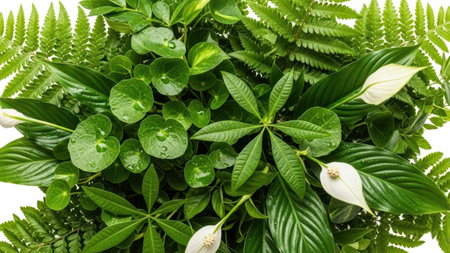 A vibrant layout of lush ferns and tropical leaves interspersed with colorful flowers, creating a harmonious and fresh natural arrangement on a white background.