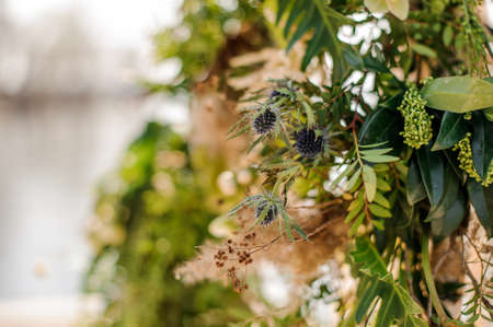 Beautiful green flower decorating a stylish european wedding arch on the blurred background of water