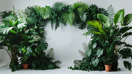 Lush tropical foliage forms an arch against a white backdrop, creating a vibrant and natural setting. Ai generated image